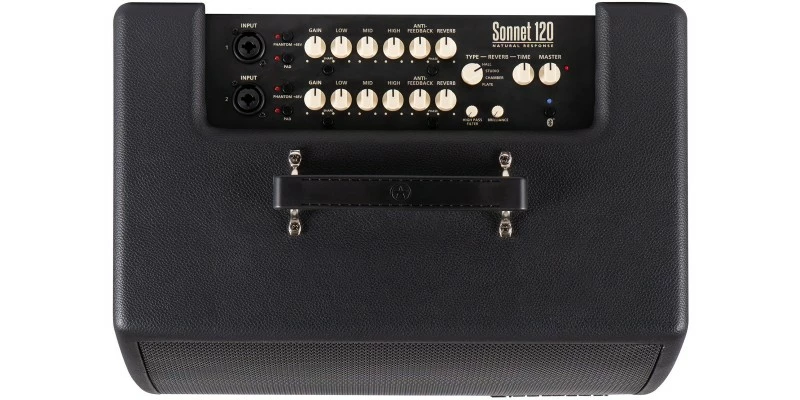 Other advanced features include phase controls and anti-feedback level controls for each channel. Channel-specific Pad and Shape controls are also included, as well as separate XLR D.I. outputs. As with the Sonnet 60, the 120 comes with a High Pass Filter, Brilliance control, USB audio out, MP3/Line in, and Bluetooth audio connectivity. A footswitch socket allows connection of the optional FS-17 footswitch, for audio mute and REVERB on/off functionality. a tilt-back stand allows for optimum sound projection.