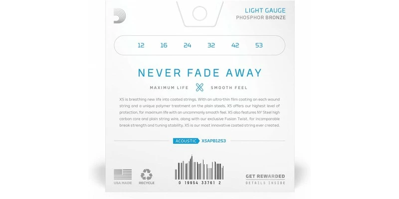 The DβAddario XSAPB1253 XS Phosphor Bronze acoustic guitar string set is here available in Light tension, with 12-53 gauge strings. These groundbreaking strings feature an ultra-thin coating on the wound strings, combined with a unique polymer treatment on the plain strings. The result is ultra-long life with minimal acoustic damping for outstanding acoustic tone. DβAddario XS Phosphor Bronze Acoustic Guitar strings are now available from Merchant City Music, Glasgowβs longest-established guitar specialist. We ship fast to the UK, Europe and worldwide.