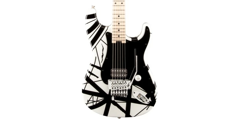 Based on Eddie’s famous striped guitar, the EVH Striped Series White and Black guitar features a single ply black scratchplate. The double locking trem consists of a Floyd Rose locking nut and an EVH-branded Floyd Rose locking tremolo with the handy EVH D-Tuna installed on the low E string. The EVH D-Tuna allows you to drop the low E to a D without the hassle of undoing the locking nuts and retuning the whole guitar, drop D in an instant!