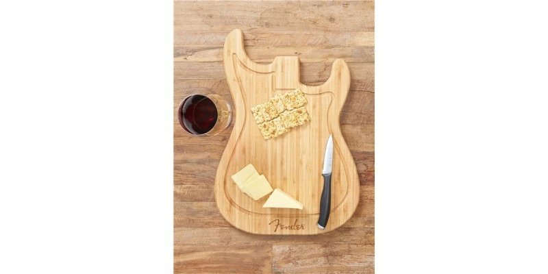 The Fender Strat Bamboo Chopping Board is the ideal gift for the guitarist who likes to cook. Stratocaster fans can now chop their dinner up on this funky looking cutting board. For sale online at Guitar.co.uk and in our Glasgow shop, Merchant City Music. Fast UK and European delivery service. This is the new, updated version made from 100% bamboo.
