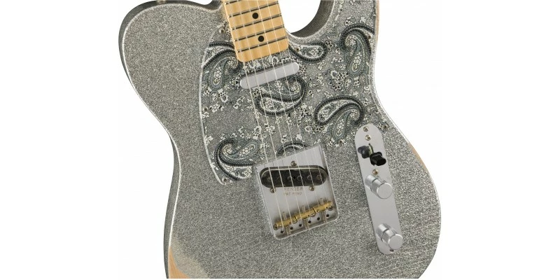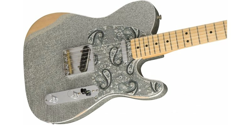 A clear plastic pickguard, adorned with black and silver paisley, lets the cool sparkle finish to shine through.