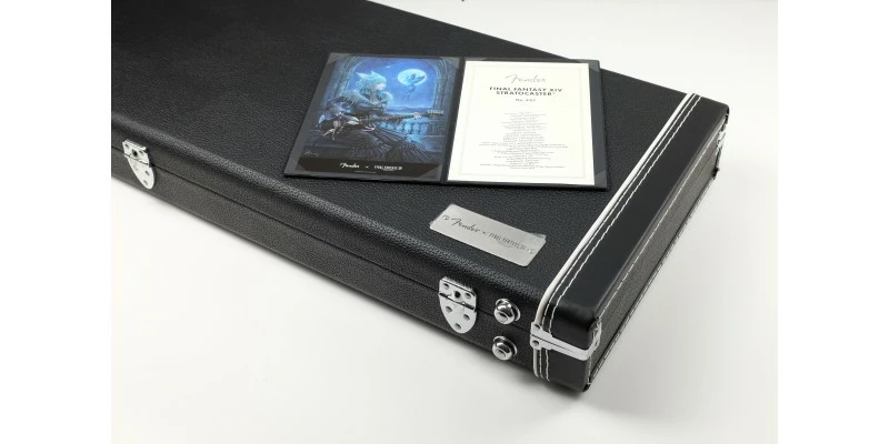 The FFXIV Stratocaster is highlighted with special game badging in the form of a meteor symbol inlaid into the 12th fret and a numbered neck plate decorated with the Final Fantasy XIV logo. Another special badge featuring both Fender and FFXIV logos adorns the front of the included vintage-style hardshell case. The guitar also comes with a special book containing a numbered certificate and an exclusive FFXIV illustration card made by Square Enix.