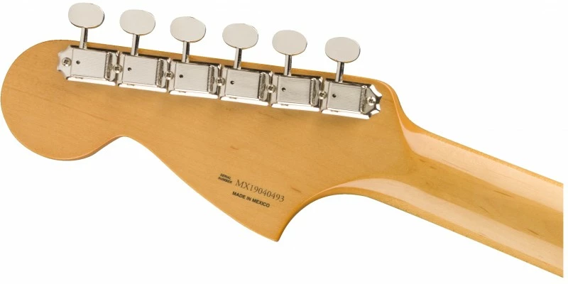The pair of single-coil Jaguar pickups sound and feel more like the originals—keeping the focusing cages for authentic, vintage-style tone and looks. The chiming neck pickup is tempered by the bright, aggressive bridge pickup. The “Mid 60s C”-shaped neck has a 7.25”-radius fingerboard with 22 vintage-style frets for classic playing feel. Vintage-style Jaguar bridge, tremolo and tuning machines provide original-era aesthetics, rock-solid performance and tuning stability. Other features include the classic lead/rhythm circuit, chrome hardware and 4-bolt neck plate. Includes a deluxe gig bag.