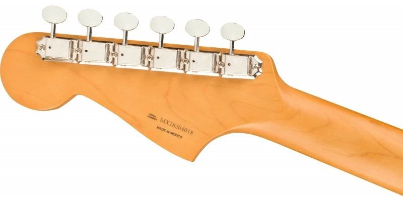 For modern Fender® tone, Fender re-voiced the pair of single-coil Jazzmaster pickups, kicking things up a bit by increasing the output. The warm, smooth-sounding neck pickup is balanced by the bright, cutting bridge pickup. The “Modern C”-shaped neck has a 9.5”-radius maple fingerboard with 21 medium-jumbo frets for modern playing feel. An Adjusto-matic™ bridge is paired to Jazzmaster floating tremolo and vintage-style tuning machines provide original-era aesthetics, rock-solid performance and tuning stability. Other features include the classic lead/rhythm circuit, chrome hardware and 4-bolt neck plate. Includes a deluxe gig bag.