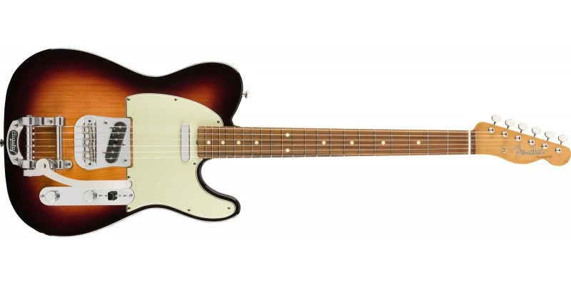 The pair of โ60s single-coil Telecaster pickups have been re-voiced to sound more like the originals. Twangy and articulate, they have the crisp, snarling tone that put Fender on the map. The thick, fat-shouldered โEarly โ60s Cโ-shaped neck has a 7.25โ-radius fingerboard with 21 vintage-style frets for classic playing feel. A Bigsby vibrato allows for expressive vibrato effects without compromising the characteristic Teleยฎ twang, while vintage-style tuning machines provide original-era aesthetics, rock-solid performance and tuning stability. Other features include four-bolt neck plate , chrome hardware and vintage-style strap buttons. Includes deluxe gig bag.