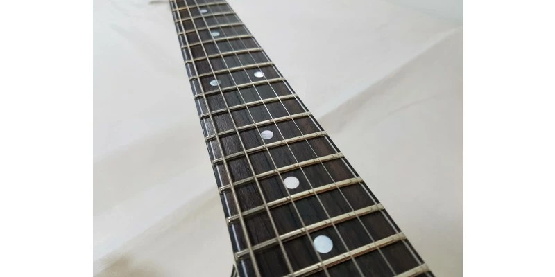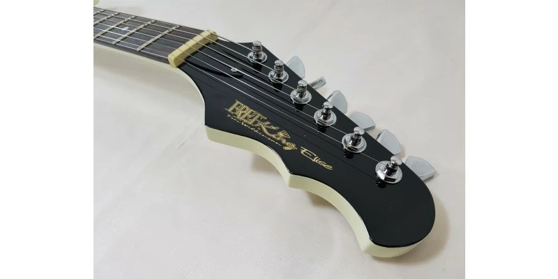 The slick mahogany neck, with deluxe rosewood fingerboard, employs the Fret-King long-tenon neck joint, which mates precisely to the body underneath the neck pickup, forming a rigid fixed bond between neck and body, maximising the retention and transmission of the Elise’s fundamental acoustic properties.