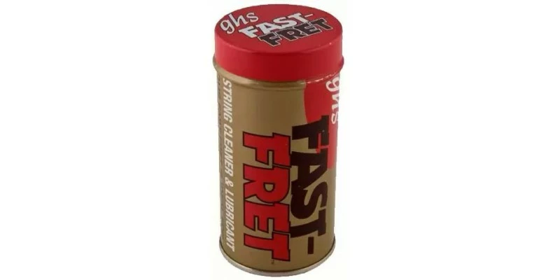 GHS Fast Fret guitar string cleaner extends the life of your strings and protects the fingerboard. Our latest delivery of Fast Fret gave us a nice surprise to see it is being packaged in a tin can once more rather than the flimsy plastic tube. It seems to smell even better too! Just glide the fastfret on with the applicator and wipe it off with the provided lint-free cloth. It keeps your strings extremely clean and allows you to play faster. It also reduces excessive finger noise. A secret of the pros GHS Fast Fret made in the USA.