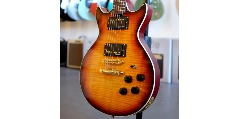 The GS Deluxe body is made of a solid piece of mahogany, to match the neck, lightly stained and satin finished. The top is Gloss Cognac Burst over highly figured Flamed Sycamore, framed with ivory Binding. This guitar also has a Matching Headstock featuring the same figured Sycamore Cognac Burst finish as the Body.