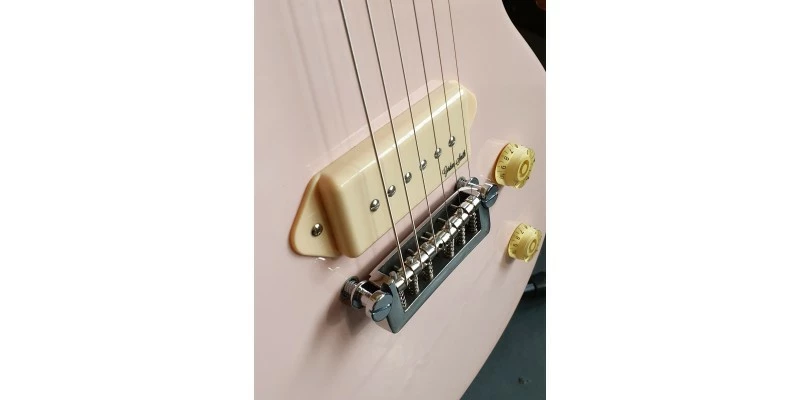 The Gordon Smith GS1-60 Shell Pink comes with its own great quality hardware. There is one Gordon Smith Dog Ear P-100 stacked humbucker pickup in the bridge position. Volume and Tone controls are included, with a switch in the volume control giving access to hotter and milder pickup outputs. At its core, the pickup is capable of big outputs, and sounds massive through a good valve amp.