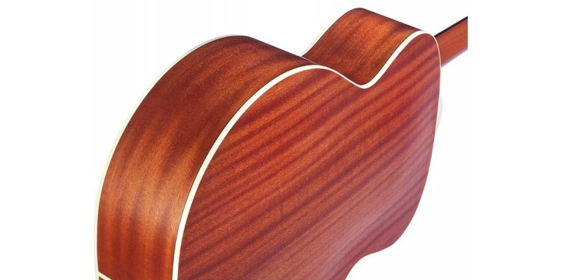 The Westerly Guild Jumbo Junior Mahogany Travel Guitar features a solid top and a bone nut and saddle.