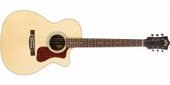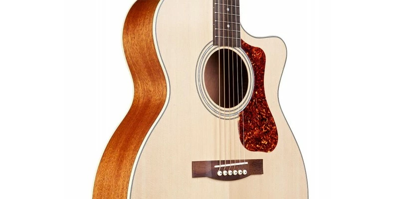 The Archback Cutaway Guild OM-240CE Westerly in Natural features a solid top and a bone nut and saddle.