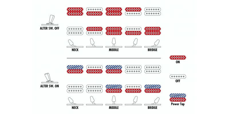 - dyna-MIX10 switching system with Alter Switch: The dyna-MIX 10 offers ten sound variations and can easily switch from humbucker and single coil modes with the mini switch. The power Tap mode provides a realistic single coil sound despite its two humbucker pickup layout.