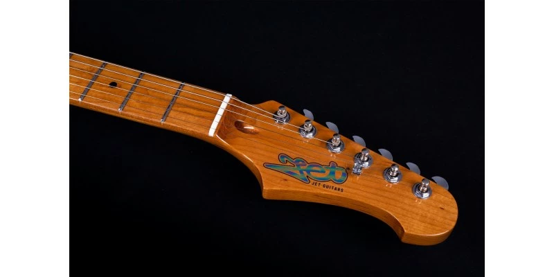 With a lightweight and resonant Basswood body, combined with a Roasted Canadian Maple neck / fretboard, the Jet JS-300 gets off to a very good start. This guitar really has looks to die for, with a rich gloss finish showing off the Sea Foam Green body and Roasted neck to full effect. Aged plastic knobs and pickup covers give it a vintage look which complements the caramel hue of the neck and multi-ply Parchment pickguard.