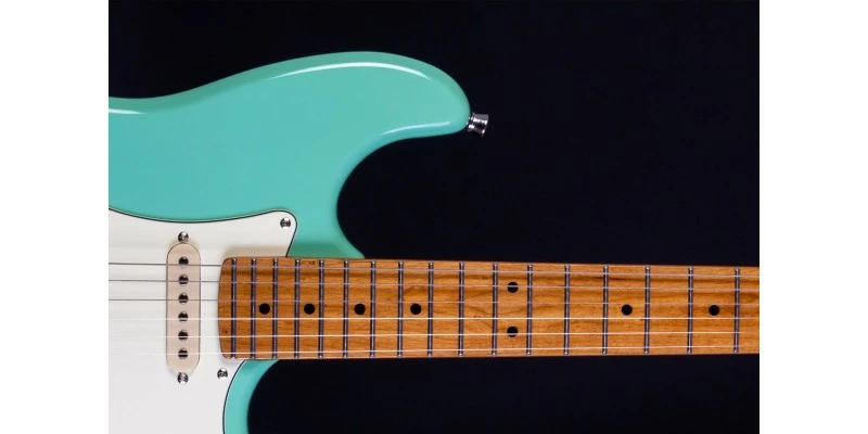 With a phenomenal spec sheet and build quality for the price, the Jet JS-300 S-Style electric guitar is here presented in Sea Foam Green with Roasted Maple Fretboard. Jet guitars are inspired by classic high end guitars, and they really do look and feel much more expensive than they in fact are! The JS-300 is fitted with three ceramic magnet single-coil pickups, resulting in an appropriate Stratty twang. The tremolo enables the whammy bar action to match, while the bone nut and Roasted Maple fretboard are usually unseen at this price.