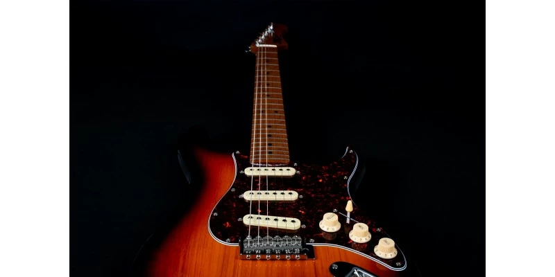 In terms of hardware, a vintage-style synchonised tremolo has been fitted, along with chrome closed-gear tuners. The bone nut ensures that all vibrations from the strings are transferred to the three ceramic single-coil pickups. These are controlled via the classic volume / 2 x tone knobs and 5-way switch layout.