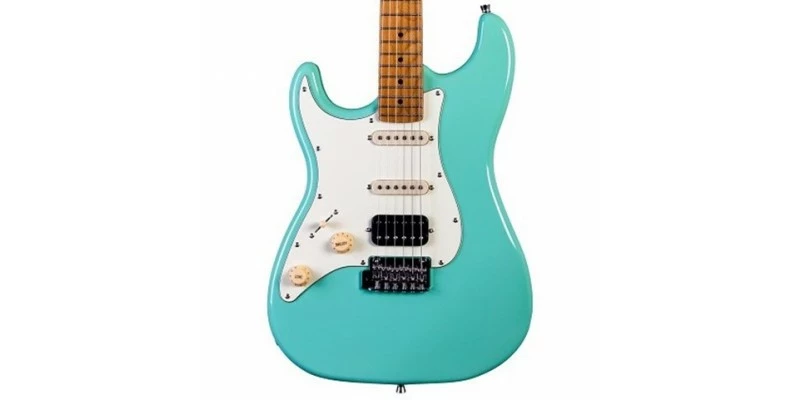 With a phenomenal spec sheet and build quality for the price, the Left Handed Jet JS-400 S-Style electric guitar is here presented in Sea Foam Green with Roasted Maple Fretboard. Jet guitars are inspired by classic high end guitars, and they really do look and feel much more expensive than they in fact are! The JS400 is fitted with three ceramic magnet pickups in HSS configuration, resulting a hugely versatile range of tones. The bone nut and Roasted Maple fretboard are usually unseen at this price, as are the upgraded 2-point trem system and sculpted plate-less neck heel.