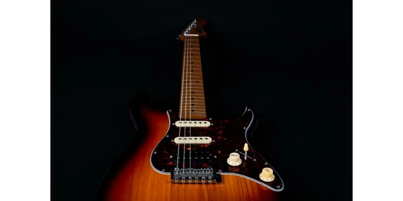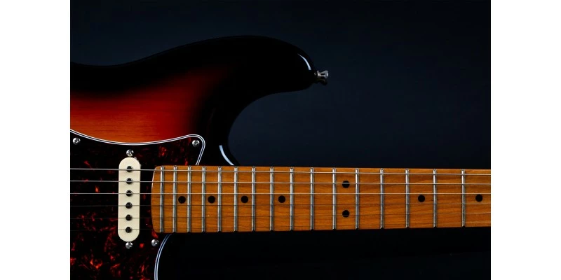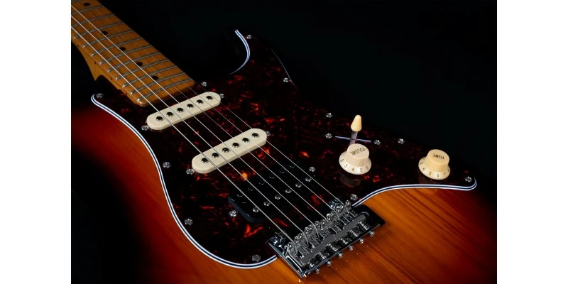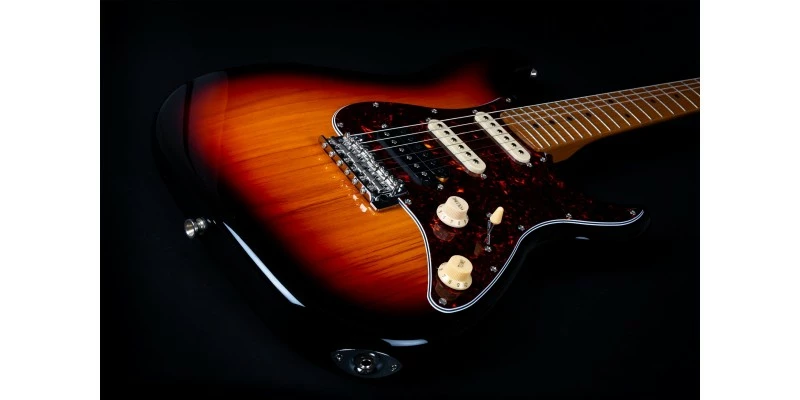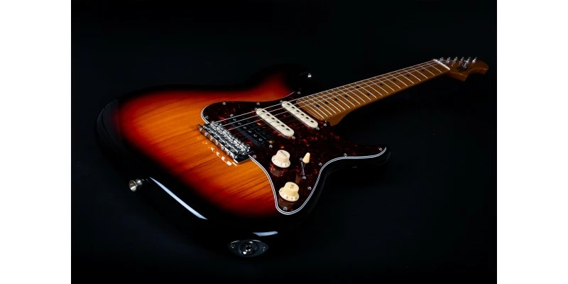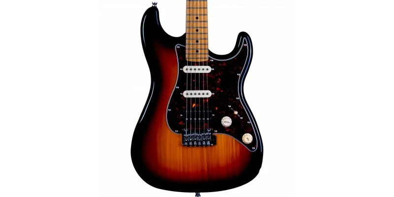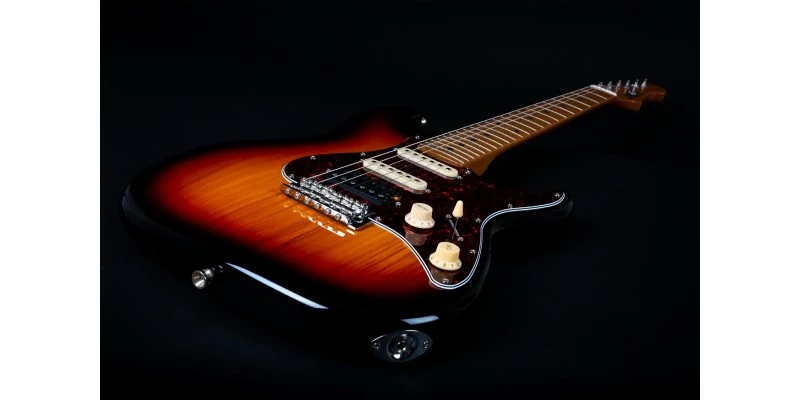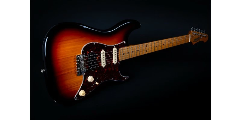 With a phenomenal spec sheet and build quality for the price, the Jet JS-400 S-Style electric guitar is here presented in Sunburst with Roasted Maple Fretboard. Jet guitars are inspired by classic high end guitars, and they really do look and feel much more expensive than they in fact are! The JS-400 is fitted with three ceramic magnet pickups in HSS configuration, resulting a hugely versatile range of tones. The bone nut and Roasted Maple fretboard are usually unseen at this price, as are the upgraded 2-point trem system and sculpted plate-less neck heel.