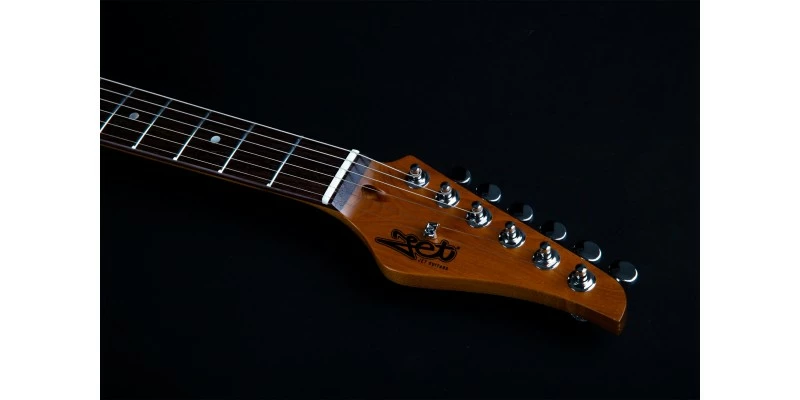 With a lightweight and resonant Basswood body – here topped with Burl Poplar – combined with a Roasted Canadian Maple neck / Rosewood fretboard, the Jet JS-450 gets off to a very good start. This guitar really has looks to die for, with a rich gloss Transparent Brown finish allowing the Burl Poplar top to show through to full effect. Aged plastic knobs and pickup covers are offset by the Pearloid pickguard for a premium look which complements the caramel hue of the neck.