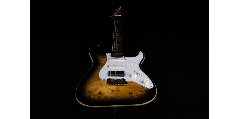 With a phenomenal spec sheet and build quality for the price, the Jet JS-450 S-Style electric guitar is here presented in Transparent Brown with Burl Poplar top and Rosewood Fretboard. Jet guitars are inspired by classic high end guitars, and they really do look and feel much more expensive than they in fact are! In addition to the stunning Burl Poplar top, the JS-450 is upgraded with a 2-Point Wilkinson Tremolo system, Pearloid Pickguard, Cream body binding and locking tuners. It produces a hugely versatile range of tones, thanks to its HSS pickup configuration.