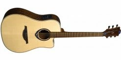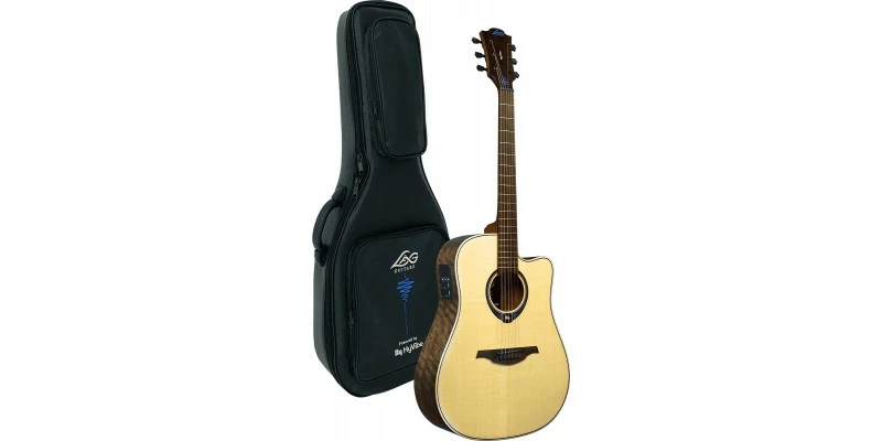 The LAG Tramontane HyVibe 20 is the mid-range model in the HyVibe range, set apart by the premium gloss finish and inclusion of a high quality HyVibe-branded luxury gig bag. Its acoustic tone reflects the use of Engelmann Spruce and Ovankol for the tone woods, with a bright, complex voice. The Dreadnought body with cutaway provides great acoustic projection and unhindered access to the higher frets. Lagβs thin-profile neck makes the Tramontane HyVibe 20 very intuitive and easy to play.