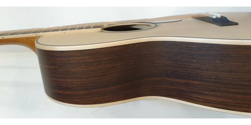 Sitka Spruce combined with Indian Rosewood is, for some, the ultimate tone wood pairing. Its complex sound is produced by the attack of the Sitka and the overtone-rich resonance of the Rosewood. Larrivee’s “Scalloped Parabolic Hybrid” bracing design brings the best of this already-outstanding combination. A non-symmetrical scalloped lateral cross-bracing pattern has been blended with Larrivee’s tried and true balanced X-Brace system. The result is maximum strength using the least amount of material. It’s a build that allows even further vibration of the soundboard, while still offering a controlled dynamic bass response.