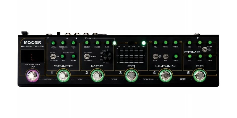 The MOOER BLACK TRUCK combines 6 individual effects pedals, a high-precision tuner, an effects loop and a loop switcher. Bringing them all together into a single portable unitΒ that’s built for the road. Although incredibly versatile and useful as a tool for all styles of music, BLACK TRUCK has been designed primarily for hard rock and heavy metal musicians. WithΒ this in-mind, a carefully selected array of popular analogue pedals from the MOOER MICRO SERIES make up the COMPRESSOR. OVERDIVE and EQ modules.