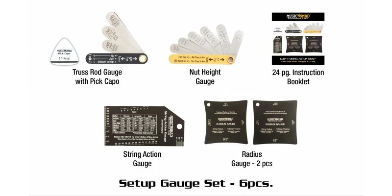 Not only is it fun, but a properly setup guitar takes your playing & sound to a whole new level. Music Nomadβs 6 pc. Precision Setup Gauge Set demystifies the setup process by including innovative, high quality gauges combined with step-by-step general guidelines anybody can follow to help setup their guitar or bass. After several years of research & development and in collaboration with Master Guitar Tech Geoff Luttrell & other top repair techs, Music Nomad has developed the KEEP IT SIMPLE, SETUP (KISS)β’.