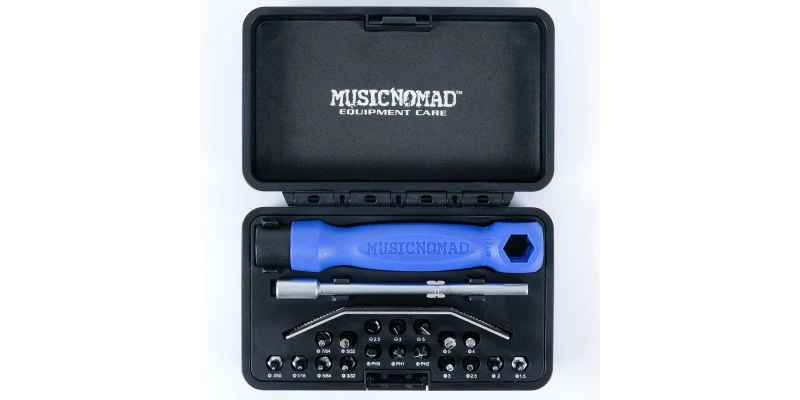 The MusicNomad Premium Guitar Tech Screwdriver And Wrench Set MN229 includes everything you need to adjust your guitar. Includes: 18 bits, 7 hex wrench sizes and MusicNomadโs Premium Spanner Wrench (MN224). It all comes in a compact, lightweight and strong aluminium case for easy transportation.