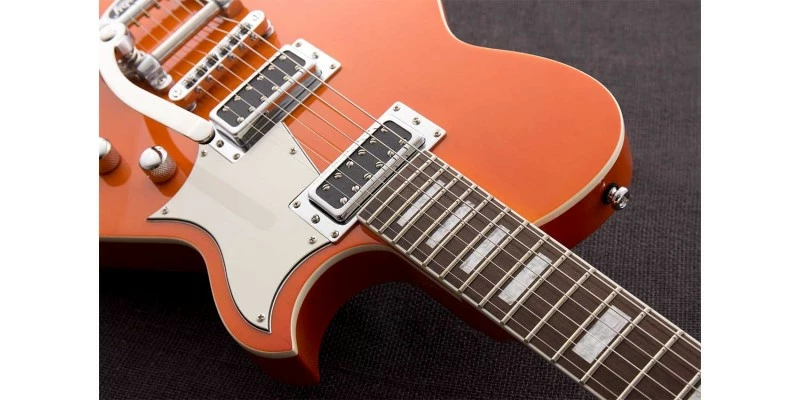 THE CONTENDER RB IN ROCK ORANGE – REVERENDโS NEW FLAT TOP, SINGLE CUT, SET NECK ELECTRIC GUITAR