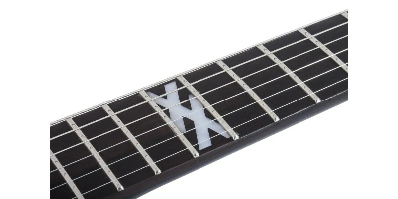 You’re getting a solid alder body with a bolt-on maple neck that’s been graphite reinforced and an ebony fretboard with 14 inch radius, while a single Schecter USA Pasadena Plus pickup sits at the bridge and a volume pot and kill switch completes the stripped back controls. Polished off with aesthetic perks in all the right places, this unique model boasts a double X inlay at the 12th fret, a set of Luminlay side dots, and pinstripe detailing beneath the strings.