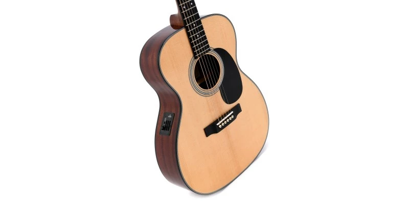 The Sigma 000M-1E is a 000-size electro-acoustic guitar with solid Sitka Spruce top and Mahogany back and sides. This UK-exclusive model comes fitted with a Sigma Preamp with built-in electronic tuner for easy on-stage performance. A subtle premium look is provided by the high gloss finish and black body binding.