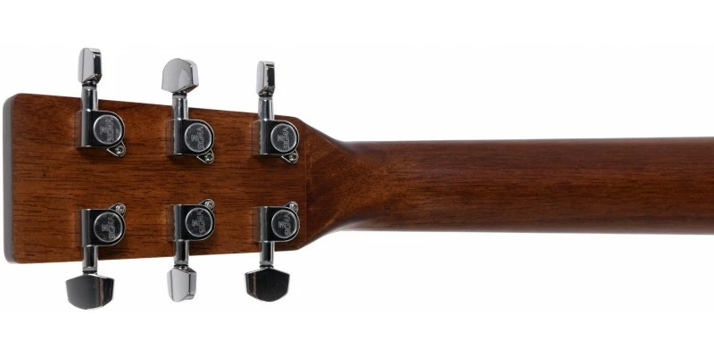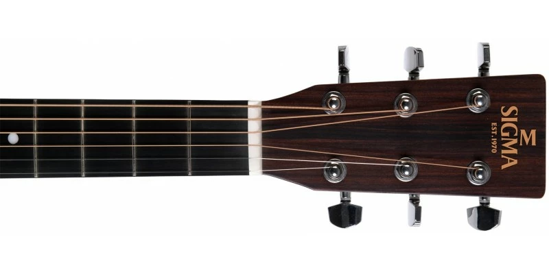 The Sigma DME is a full body dreadnought acoustic guitar. It features a solid Spruce top paired with Mahogany back and sides. What’s more, the DME is fitted with a bone nut and saddle. This gives this guitar a superb acoustic tone that will quite easily shame bigger brands costing several times as much. It’s bright and airy with plenty of body and detail. The Sigma DME doesn’t just stop there. Fitted to the side of the body is an active Sigma CE 304 preamp with volume, bass, middle and treble controls along with a chromatic guitar tuner. The Mahogany neck has a narrow 42.9mm nut and a substantial rounded profile.