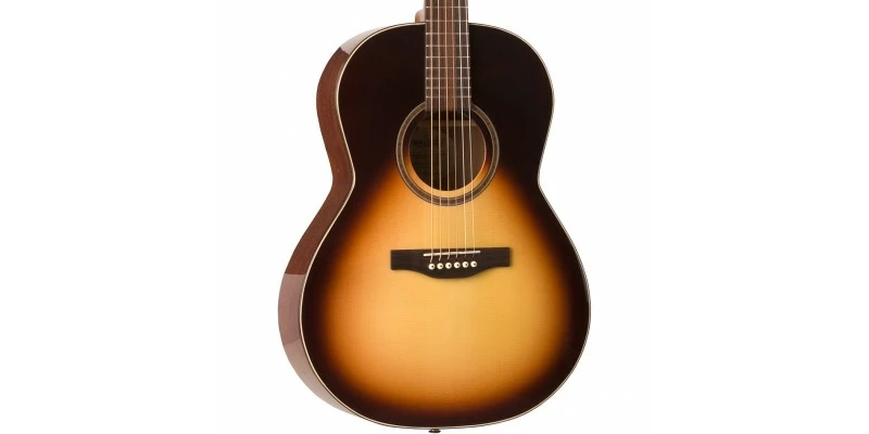 Ideal for fingerstyle players, the mid-range frequencies and tonal qualities of the Simon and Patrick Woodland Pro Folk Sunburst acoustic guitar is in large part due to its smaller body size. Featuring all solid wood and a brilliant high-gloss Custom Polished finish, as well as a vintage style slotted headstock and butter-bean tuning machines.