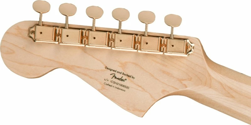 The Squier 40th Anniversary Jazzmaster, Gold Edition is a stylish model adorned with an eye-catching collection of upscale features for the discerning Squier fanatic. Featuring striking gold-plated hardware, a gold anodized aluminum pickguard, a bound Indian laurel fingerboard with pearloid block inlays, an engraved anniversary neck plate and gloss finish throughout, this Jazzmaster is poised and ready for the spotlight. Player-friendly refinements of this commemorative model include a slim and comfortable โCโ-shaped neck profile for an easy playing feel, vintage-style tuning machines and 6-saddle floating bridge and tremolo for authentic performance and style, and Fender-Designed single-coil pickups with alnico 5 magnets for familiar Jazzmaster tone.