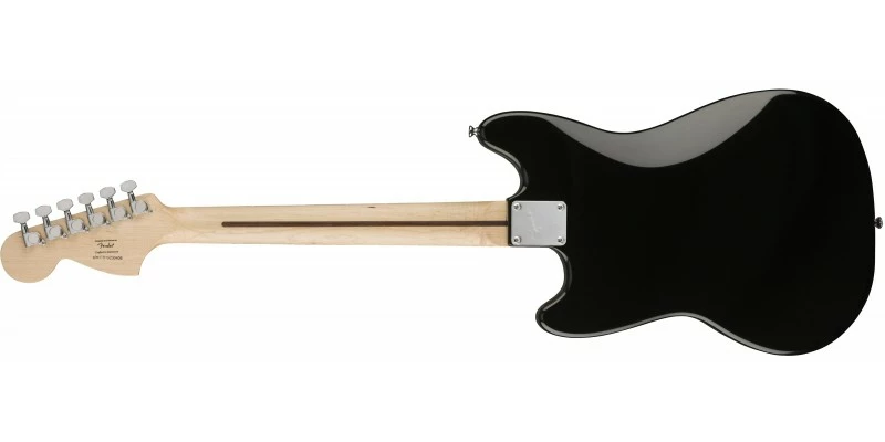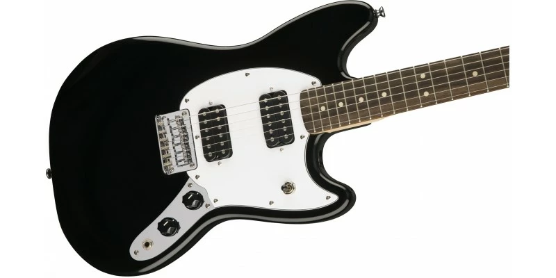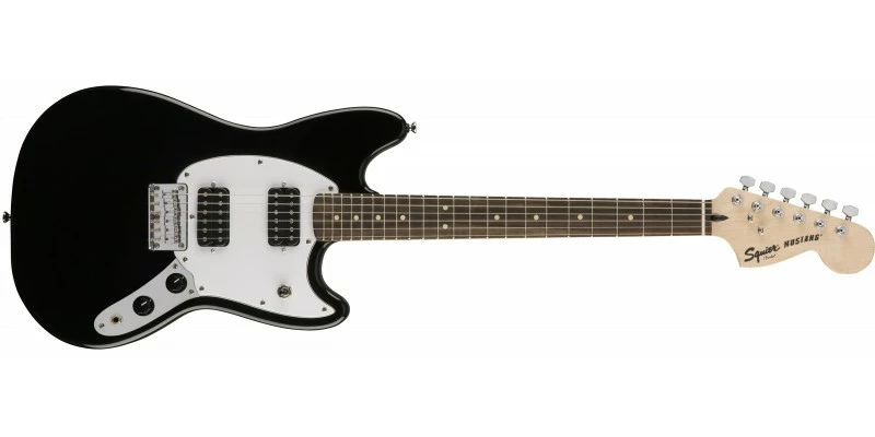 The Squier Bullet Mustang HH in Black features a shorter 24 inch scale length and a hard tail.