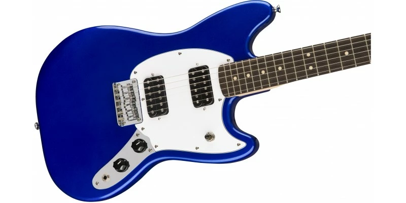 The Squier Bullet Mustang HH in Imperial Blue features a shorter 24 inch scale length and a hard tail.