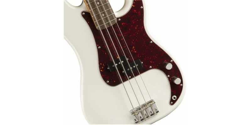 The Squier Classic Vibe ’60s Precision Bass has a gloss Olympic White finish with 4-ply Tortoiseshell pickguard. Mixing classic looks with modern playability, this P-Bass is the best of both worlds – evidence of why many gigging musicians use these Squiers as their main instrument. The Fender® Designed Alnico Split-Coil pickup provides the tone for which this seminal bass is known and loved, while the modern-playing 9.5” radius fretboard and “C” shape neck feel great.