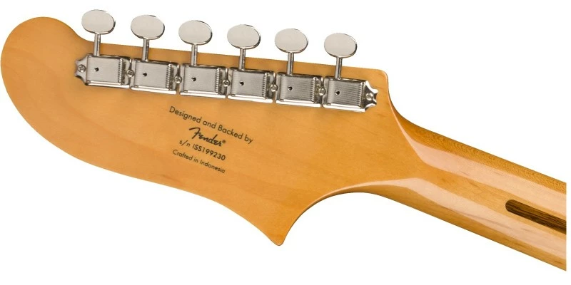 Player-friendly features include a slim, comfortable “C”-shaped neck profile with an easy-playing 9.5”-radius fingerboard and narrow-tall frets, as well as a stop tailpiece for solid tuning stability. This Squier model also sports a unique painted headstock contour, 1970s-inspired headstock markings, rich-looking nickel-plated hardware and a slick vintage-tint gloss neck finish for an old-school vibe.