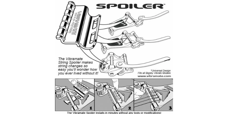 The Vibramate String Spoiler is designed to maintain the same smooth operation and feel of the classic Bigsby vibrato and may even increase the potential range of pitch bending. The fulcrum position eliminates unwanted radial strain to the ball end string wrap. The Spoiler has a polished finish and subtle appearance designed to look like it was original equipment on your guitar and vibrato. Universal fit makes the Spoiler interchangeable with all of the Bigsby Vibrato models.