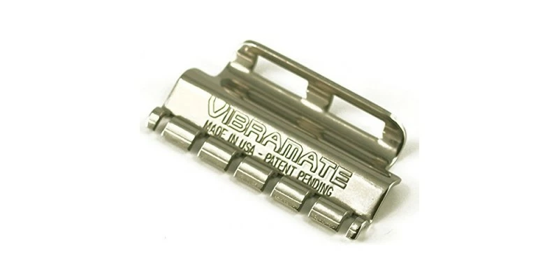 The Vibramate String Spoiler is an ingenious little bracket designed to fit right onto your existing Bigsby Vibrato without any modifications or special tools. It easily slips right into place and is held in position by the tension of the strings when tuned to pitch.