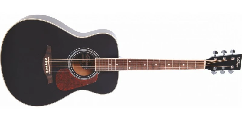 The Vintage V300 has been one of our best selling acoustic guitars for years. When you check out the specification and the price it is easy to see why. They always get a great review. This black gloss version also includes a beginners guitar starter package. This includes a gig bag, strap, tuner, spare strings and a plectrum. Everything you need to get started. The folk sized body of the V300 is supremely comfortable to sit with. Another reason that makes it a great starter acoustic. It features a solid spruce top that gives it a richer, warmer sound than a plywood instrument. The more it is played, the better it will sound. The Nato neck has a slim profile making it easy to get around.